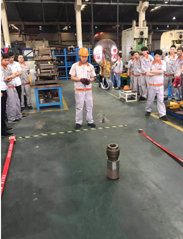 在比賽開始之前,工會主席呂曦紅、生產(chǎn)總監(jiān)蔡云峰、研發(fā)中心工程師李軍輝都到現(xiàn)場進(jìn)行了相應(yīng)的賽前道具準(zhǔn)備、場地劃線。同時對比賽的安全操作、比賽流程做了詳細(xì)的講解,以確保員工安全比賽、了解賽事規(guī)則。本項(xiàng)目之所以叫“趣味行車”比賽,就是需要三人接力、按照用時最短的原則,將一個圓柱物體用行車吊裝進(jìn)空心的圓柱體內(nèi)。這對于平時操作行車的熟練程度、技藝都有較高的要求。
