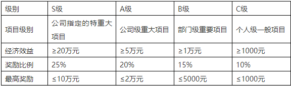 公司推行項目改善從質(zhì)量、成本、生產(chǎn)、交付、安全、設備改進、團隊及技術改善類等方面推進,不斷完善制度流程化建設,同時建立獎勵機制,按改善項目重要等級分S級、A級、B級、C級,按級別比例進行最高獎勵。