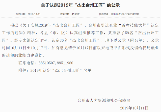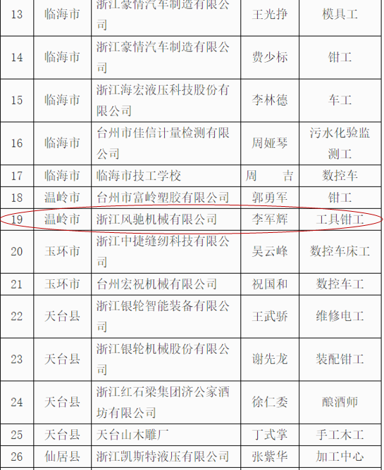 我司根據(jù)《關(guān)于實施2019年“杰出臺州工匠”、臺州市引進企業(yè)“首席技能大師”認定工作》的通知要求,通過公司推薦,資格初審,經(jīng)專家組認定評審,我司研發(fā)中心工程師李軍輝成功順利入選被評選為“杰出臺州工匠”,并在網(wǎng)上予以公示,符合公司的價值觀“客戶為先、誠信負責、團隊合作、務實創(chuàng)新”精神。