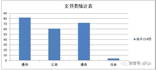 公司所有的文書類如:通知、通告、公告、任命等統(tǒng)一有正規(guī)格式,經(jīng)編輯、審核、批準(zhǔn),統(tǒng)一由總裁辦渠道發(fā)布。經(jīng)對2018年文書類統(tǒng)計(jì),各類發(fā)布如下:通知82份、公告61份、通告72份、任命4份,合計(jì)共發(fā)布文書類219份。