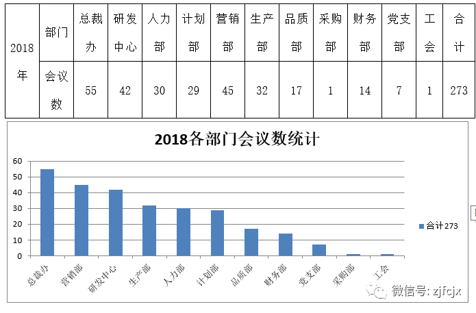 根據(jù)《公司會議管理制度》規(guī)定要求,各部門需用到公司會議室的會議需以《會議通知》的形式到總裁辦進(jìn)行登記,同時以《會議紀(jì)要》的形式到總裁辦進(jìn)行備案。經(jīng)2018年各部門到總裁辦會議數(shù)統(tǒng)計(jì)如下: